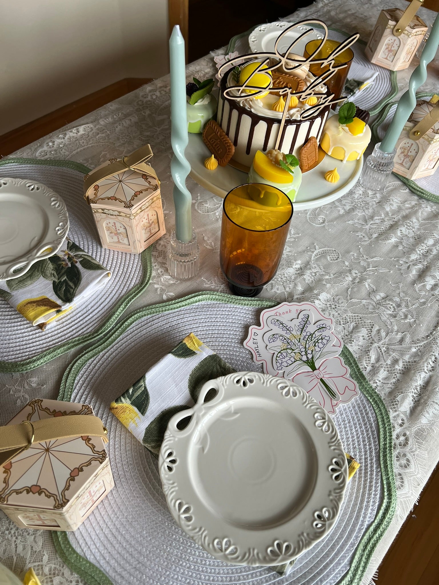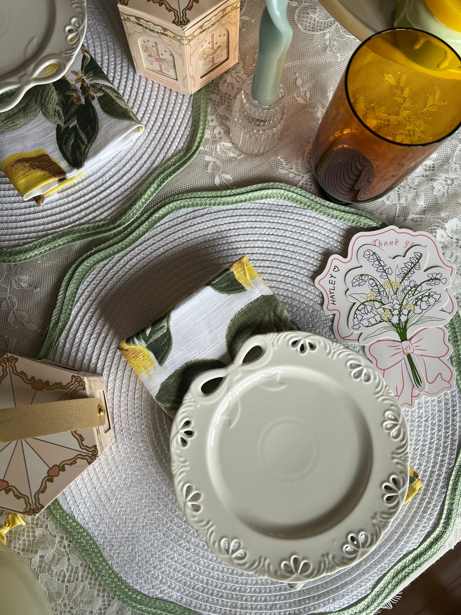With subtle pops of yellows and greens, a hint of delicate lace, and stunning ceramics and glassware, this box contains everything you need to bring a smile ☀
